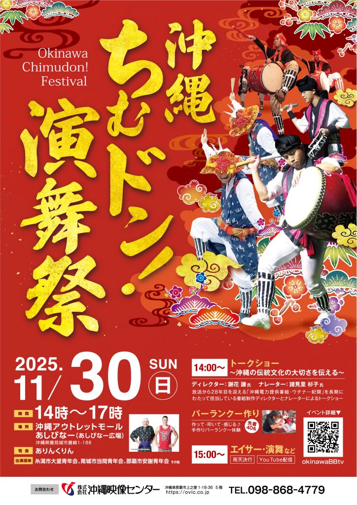 株式会社沖縄映像センターでは、沖縄の伝統文化の魅力を発信するイベント「沖縄ちむドン!演舞祭」を、2025年11月30日(日)に豊見城市豊崎にある「沖縄アウトレットモールあしびなー」のあしびなー広場にて開催いたします。