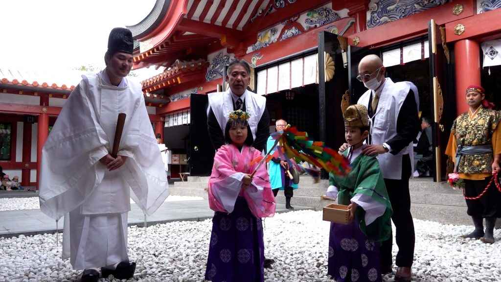 続いて、色鮮やかな装束に身を包んだ稚児たちによるお祓いが行われ、会場には和やかな雰囲気が広がりました。