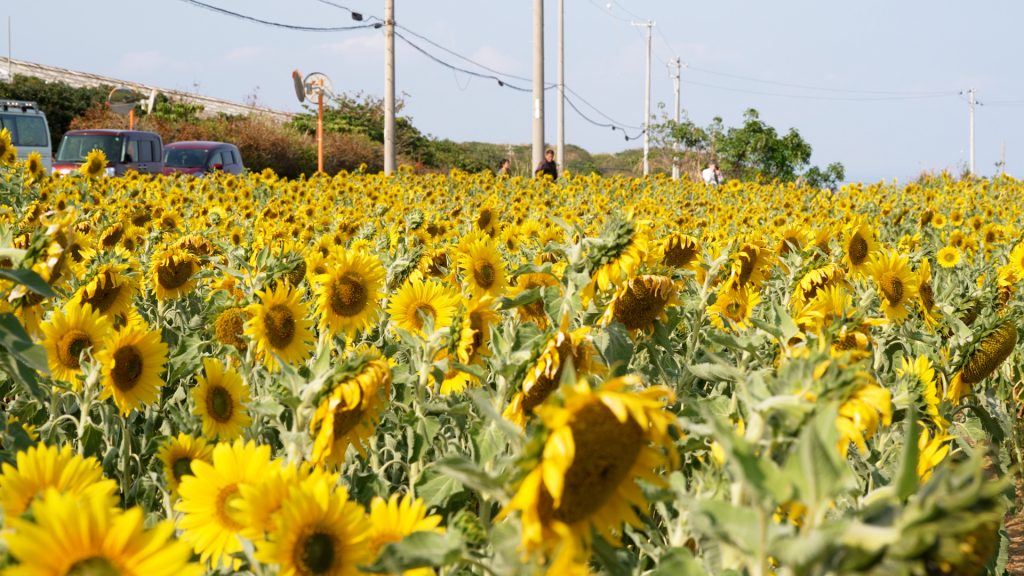 伊計島では、春の訪れとともに、美しいひまわりが咲き誇る風景が広がります。